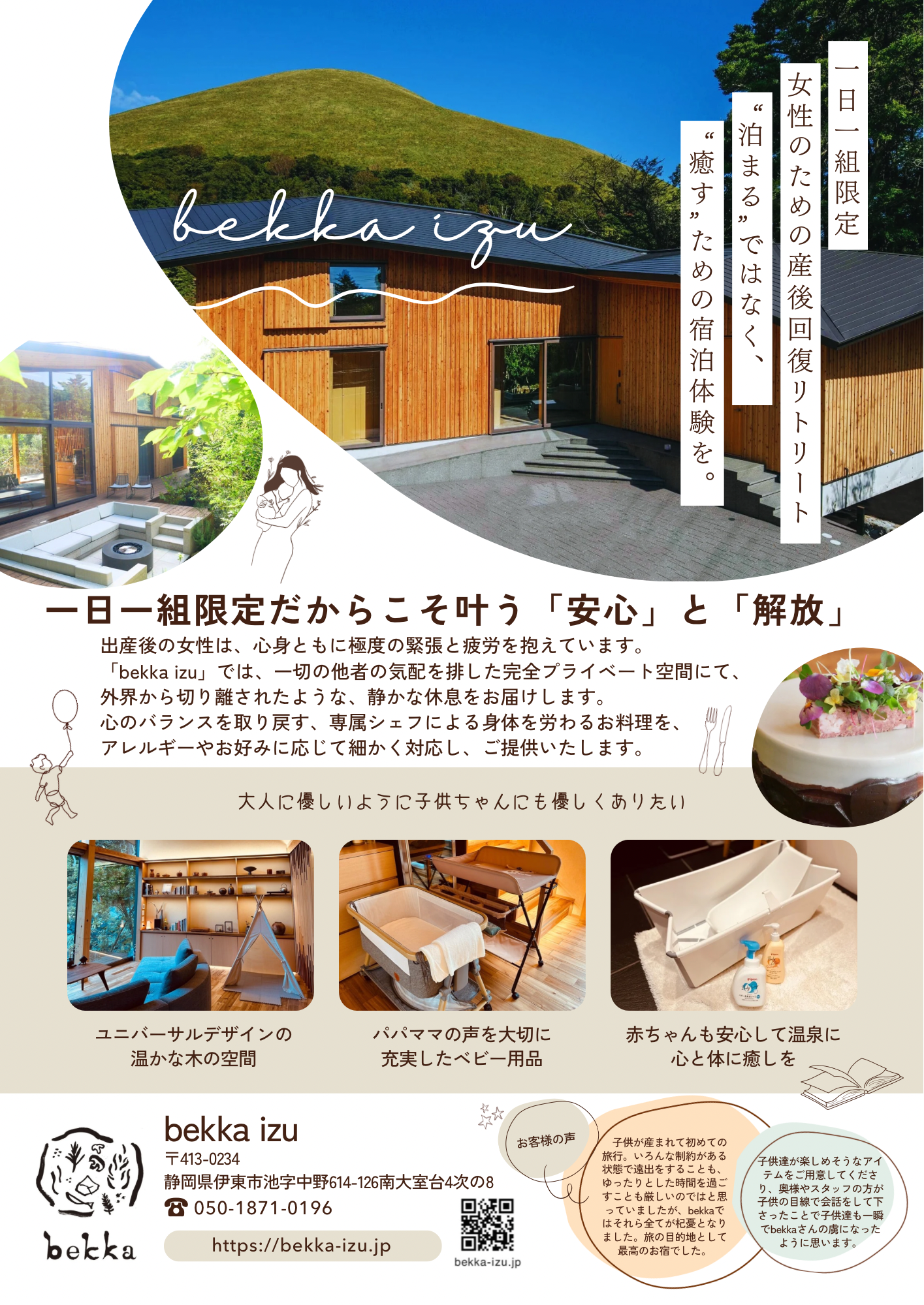 「bekka izu」では、一日一組限定という特別な環境を活かし、出産を終えたお母さまとご家族のための産後ケア滞在を承っております。
